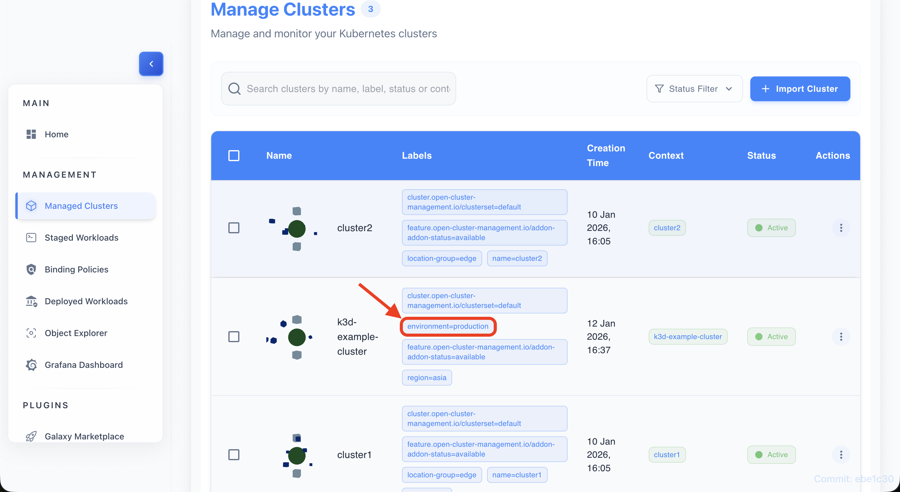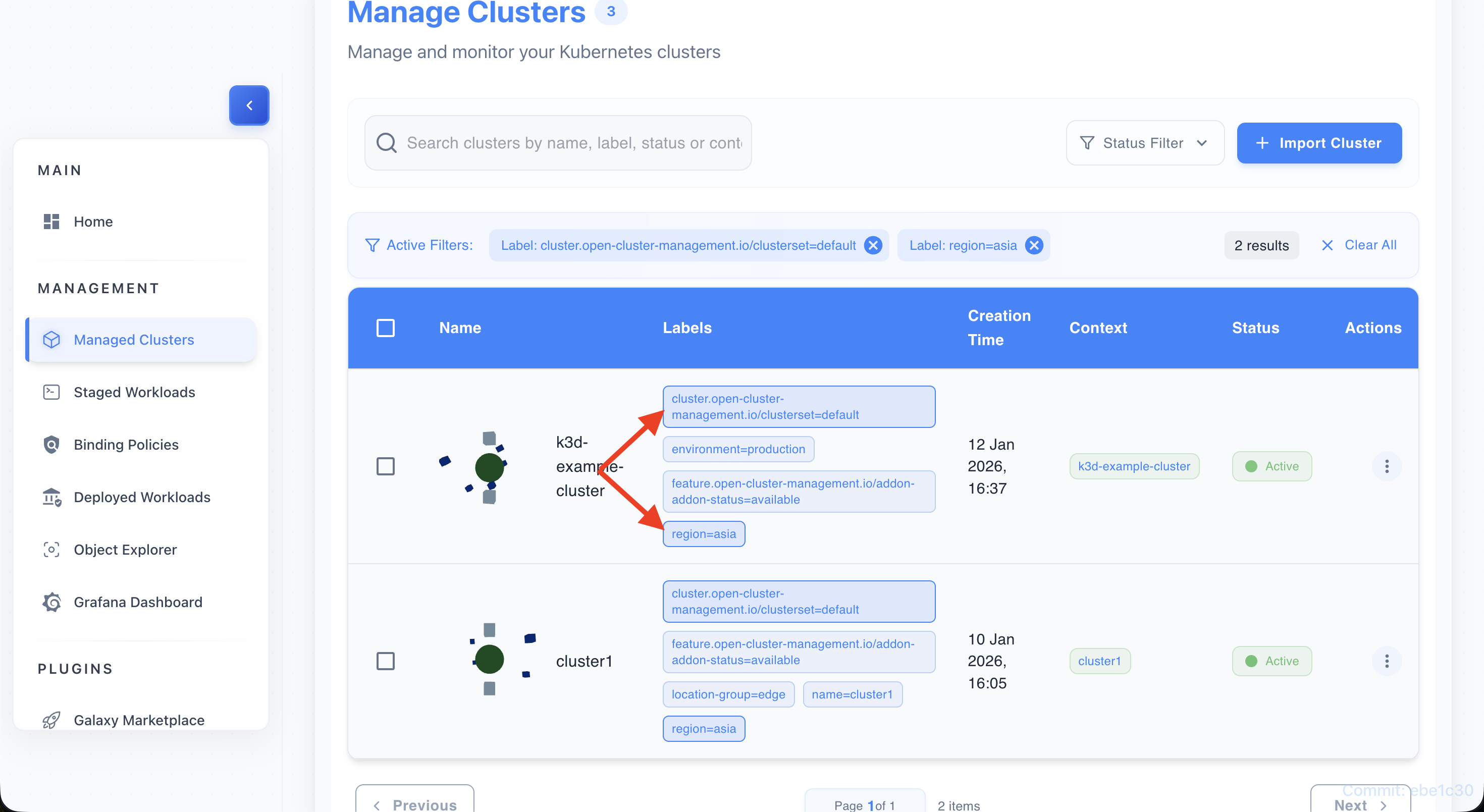 - Architecture: ITS aggregates cluster metadata, status, and labels from the KubeStellar backend. It presents search, filters, and actions to manage clusters and labels.