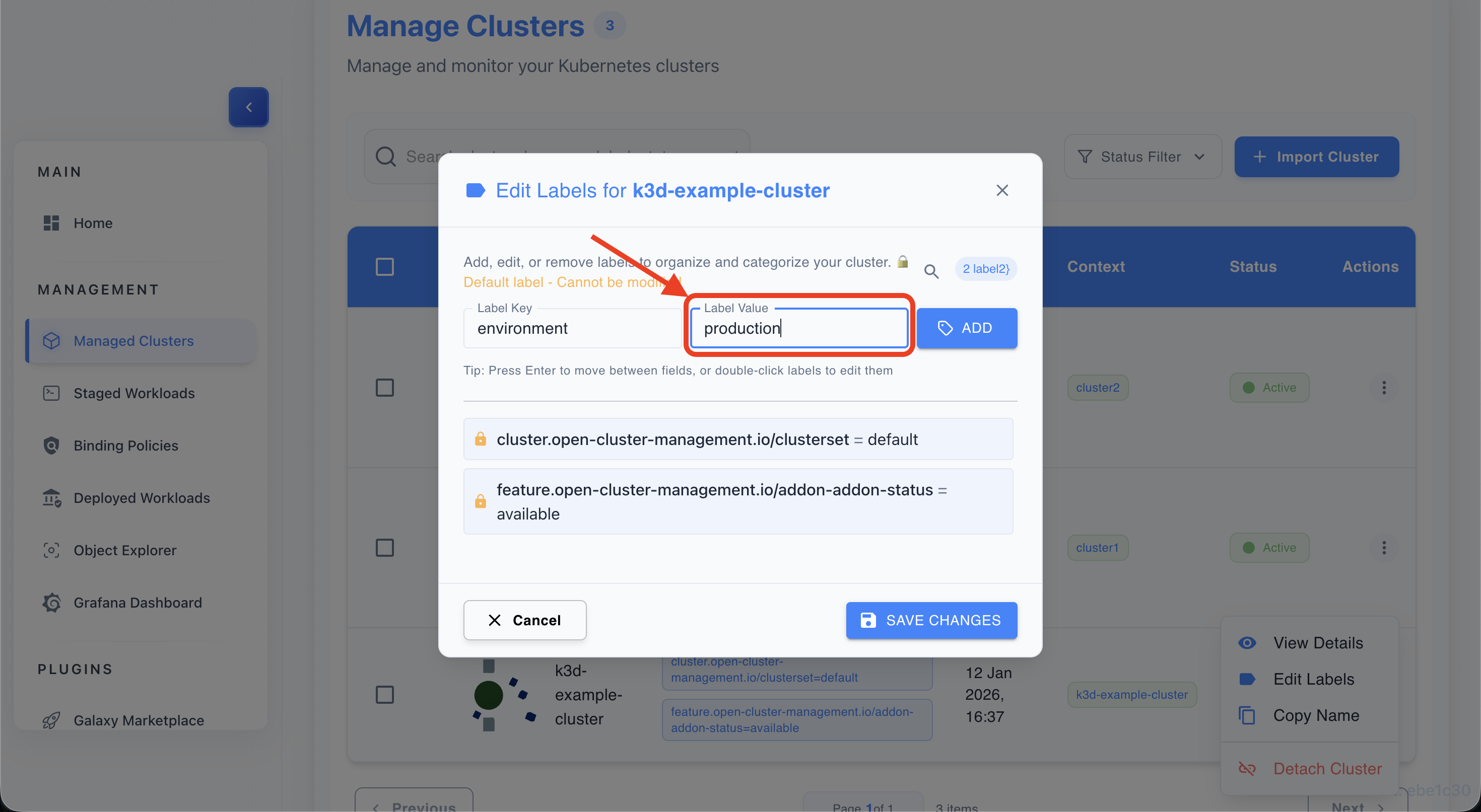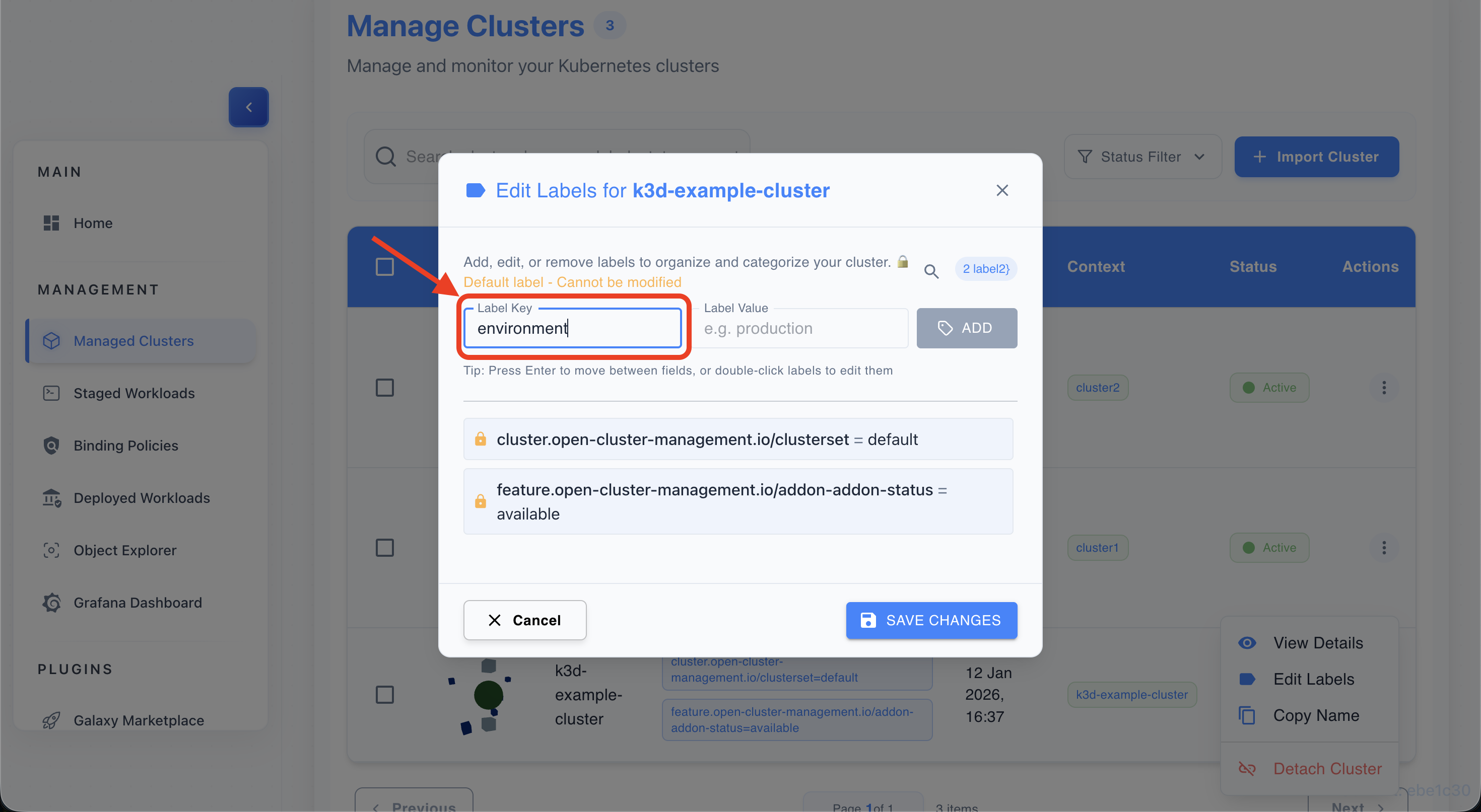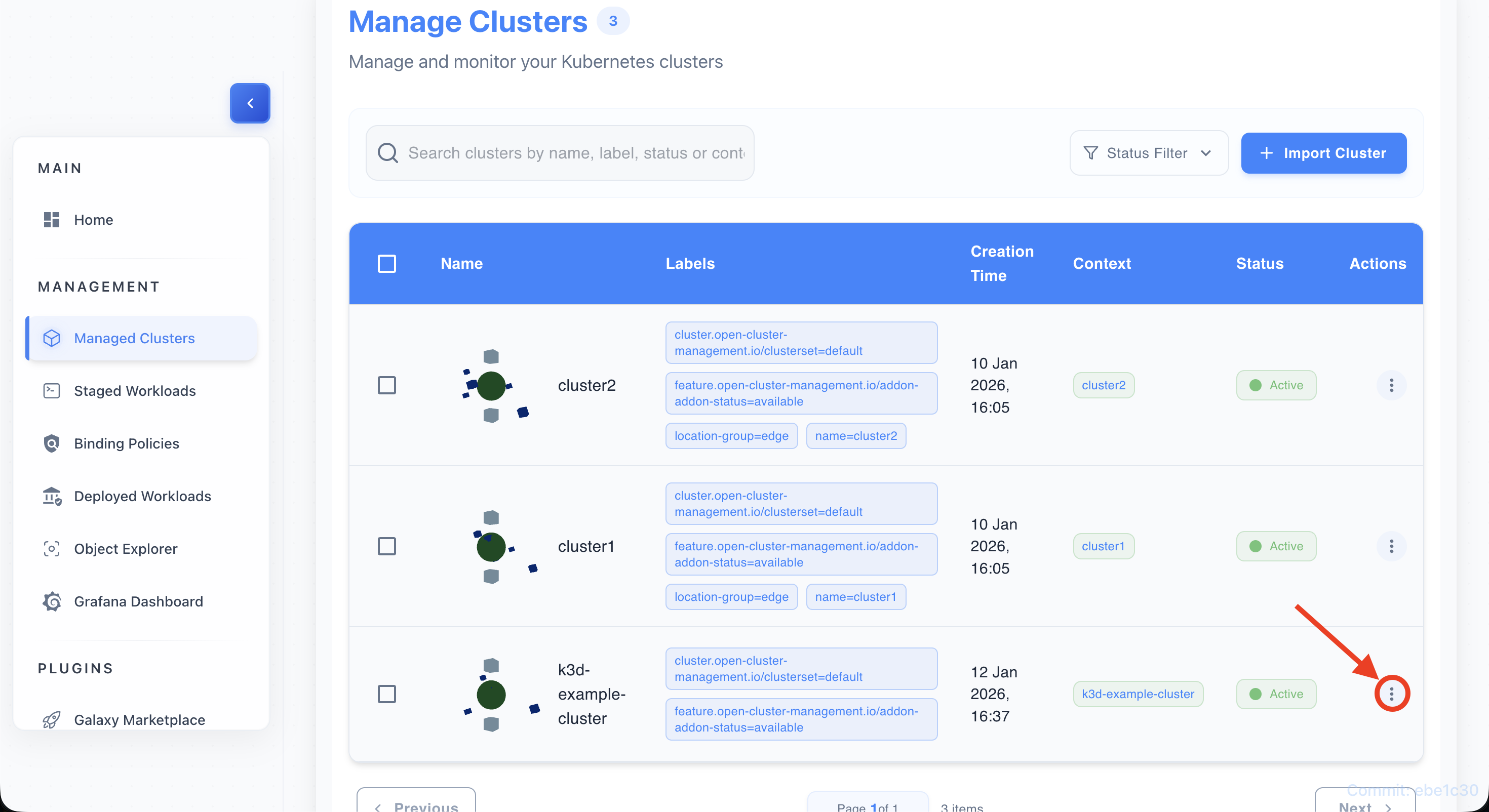 - Cluster lifecycle: Discover → Import → Label → Monitor → Detach. ITS keeps status in sync and exposes per-cluster detail dialogs and logs.